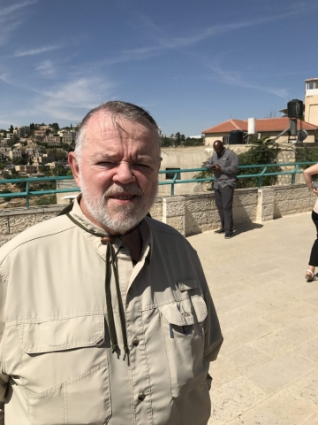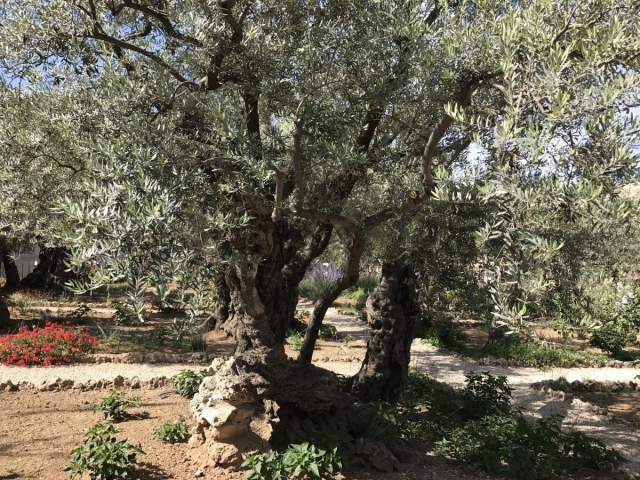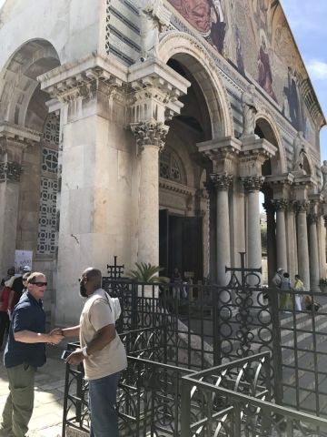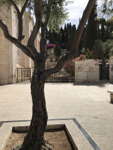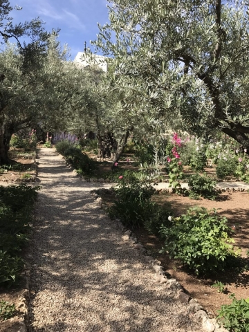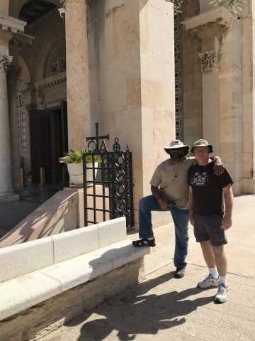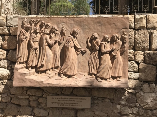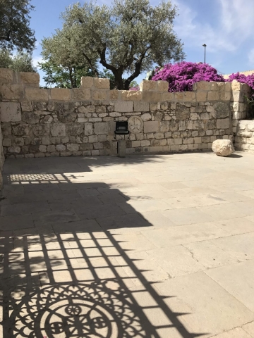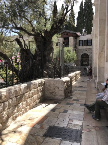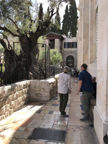 Rained most of the day. Trekked thru the rain and made some headway. Began the day on the Mount of Olives, Garden of Gethsemane, then the Western Wall, the Kotel Tunnel, the Church of St Anne and the Pools of Bethesda. We walked out of the Lions Gate and connected with Tobi our bus driver who drove us to Bethlehem for lunch, a visit to the Church of the Nativity and short time shopping in Bethlehem. We did all of our site devotionals on the bus except for Bethesda and our final site of the day, the Upper Room.