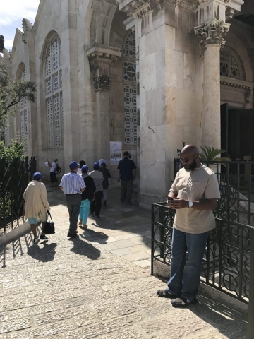 After we completed our pictures, devotionals and teaching on the Mount of Olives we walked down the Mount of Olives to Dominus Flevit, and on down the hill to the Garden of Gethsemane where we had the devotional for Dominus Flevit and the Harden of Gethsemane. We running tight on out time for entrance to the Garden of Gethsemane so we had just stepped into Dominus Flevit and continued down to our appointment in the garden of Gethsemane.